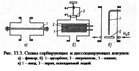 К сорбирующим ловушкам относятся механические (рис.13.3, а) и адсорбционные (рис.13.3, б). Элемент 1 изготовлен из пористого материала (медный фильтр, тонкопористое и широкопористое стекло) (рис. 13.3, а). Регенерация невозможна, поэтому по истечении срока службы фильтр заменяется. Если фильтр изготовлен из нержавеющей стали, то его можно продуть атмосферным воздухом при температуре 300 ~500°С.