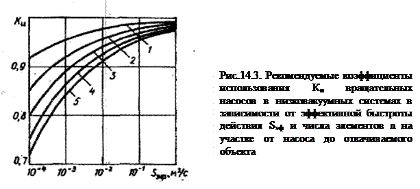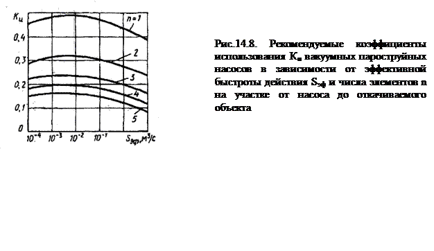 На рис. 14.3 приведены значения оптимальных коэффициентов использования насоса в зависимости от требуемой эффективной быстроты откачки для различного числа элементов на участке вакуумной системы, между насосом и откачиваемым объектом.