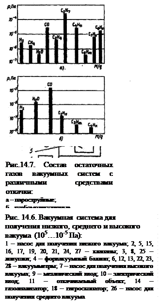 На рис. 14.2 показан примерный состав остаточных газов в низковакуумных системах с различными средствами откачки.