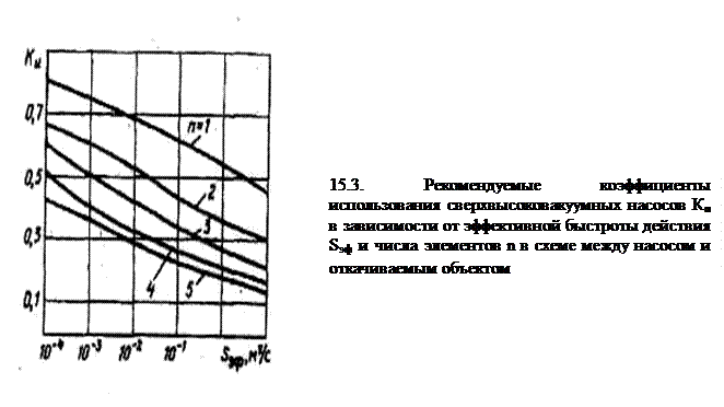 Оптимальные значения коэффициентов использования сверхвысоковакуумных насосов в зависимости от их быстроты действия в откачиваемом объекте и числа элементов в схеме между насосом и откачиваемым объектом приведены на рис. 15.3.