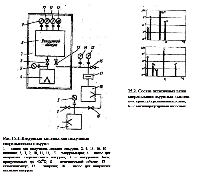 Такая система ( рис.15.1 ) содержит прогреваемый вакуумный блок 7. Прогрев до 400°С уменьшает газовыделение всех элементов вакуумной системы, непосредственно подключаемых к насосу 4. Состав остаточных, газов сверхвысоковакуумных систем показан на рис. 15.2. Основные характеристики сверхвысоковакуумных насосов приведены в табл. 15.1.