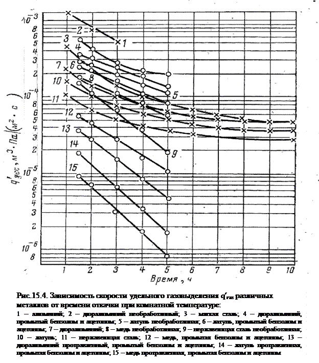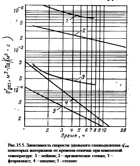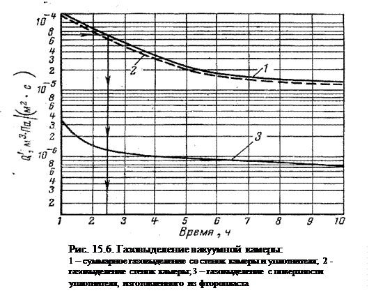 Теперь через точку Q' = 6,65·10-5 м3 ·Па/с на оси ординат проведем горизонталь до пересечения с кривой 1 скорости суммарного газовыделения. В результате получим, что давление р1 = 6,65·10-3 Па будет достигнуто примерно через 2,4 ч.