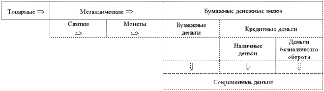На ранних стадиях развития обмена деньги существовали в товарном виде. Однако уже в традиционных обществах Древнего мира и Средневековья деньгами становятся благородные металлы, причем первоначально использовавшиеся в этих целях слитки постепенно вытесняются монетой. Бумажные денежные знаки, получившие распространение с XVIII в., первоначально соседствовали с металлическим обращением. Более того, конец XIX в. и первое десятилетие XX в. характеризовалось триумфом наиболее совершенной формы металлического обращения ¾ это короткая эпоха золотого стандарта. Однако со временем бумажные и кредитные деньги получали все более широкое распространение, одновременно избавляясь от наиболее крупных своих недостатков, в первую очередь от острой инфляционной неустойчивости. Именно на их основе постепенно сформировались современные деньги.