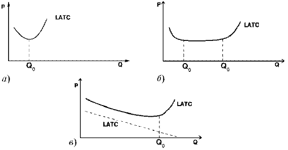 Эффект масштаба может оставаться положительным на протяженном интервале роста объема производства. То есть технологические особенности производства некоторых благ таковы, что средние издержки минимальны только при больших объемах производства (рис. 6.18 в). Поэтому рынок подобных благ формируется так, что агентами предложения являются крупные предприятия. Примерами подобных отраслей в основном служат капиталоемкие отрасли: металлургия, автомобилестроение. Значительный положительный эффект масштаба достижим также в изготовлении стандартизированной продукции ¾ зубной пасты, часов, молочных и кондитерских изделий, пива и т. п. Уже один этот перечень отраслей говорит об огромной роли, которую в современной экономике играют крупные предприятия. Принятый в годы реформ уничижительный тон описания крупных российских предприятий (в прессе их называют динозаврами, пережитками советской эпохи и т. п.) поэтому следует рассматривать как стиль политической публицистики, а не научный анализ.