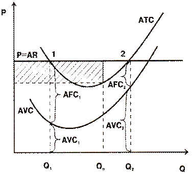 При такой цене предприятие более чем покрывает свои расходы (рис. 7.4). Цена (Р) превышает минимальную величину средних совокупных издержек (ATCmin), поэтому принципиально возможно получение прибыли. Точнее, фирма получает прибыль в зоне между точками 1 и 2, где кривая цен лежит выше уровня издержек, или, что то же самое, при объеме производства от Q1 до Q2. По размерам же прибыль равна разнице между ценой и средними общими издержками (P - ATC), умноженной на избранный объем производства Qn. То есть2: