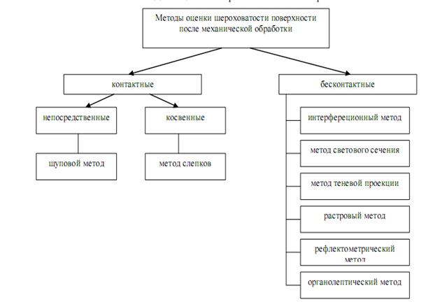 Из рассмотренного выше материала следует, что для обеспечения заданных эксплуатационных характеристик деталей машин необходимо обеспечивать в процессе производства заданный уровень их функциональных параметров, в частности, качество поверхностей по характеристикам шероховатости. Все используемые до настоящего времени методы получения информации о параметрах шероховатости поверхностей можно подразделить на контактные и бесконтактные методы, как это показано на рисунке 1.3.