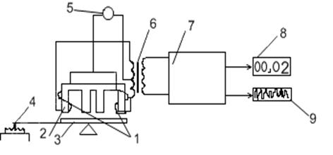 Рассмотрим принцип действия профилографа с индуктивным преобразователем, схема которого приведённого на рисунке 1.4. Электрическая часть прибора включает в себя электронный блок - 7, показывающий - 8 и записывающий - 9 приборы. Магнитная система датчика представляет сердечник - 2 с двумя катушками - 1. Катушка датчика и две половины первичной обмотки дифференциального входного трансформатора - 6 образуют балансный мост, который питается от генератора звуковой частоты - 5.