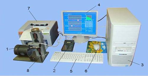 Рисунок 1.5 – Внешний вид стационарного комплекса “Абрис ПМ7”: 1 – первичный преобразователь, 2 – отсчётное устройство, 3 – системный блок, 4 – монитор, 5 – клавиатура, 6 – мышь, 7 – печатающее устройство, 8 – стойка приборная