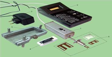 Рисунок 1.6 – Внешний вид переносного прибора “Абрис ПМ7”: 1 – первичный преобразователь, 2 – отсчётное устройство, 3 – адаптер питания, 4 – образец установочный, 5 – приспособление установочное, 6 – набор базирующих элементов