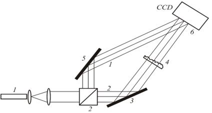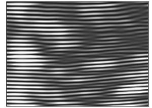 Для моделирования такой оптической схемы был разработан следующий алгоритм. Сначала производилось построение светового поля сразу за шероховатым элементом. Его амплитуда является постоянной величиной по всей площади, в то время как фаза отражает информацию о шероховатости поверхности. Набег фазы тем больше, чем толще пластинка в каждой конкретной точке. Для вычисления структуры пучка после прохождения им расстояния от шероховатого элемента до регистрирующей камеры, к исходному изображению было применено преобразование Френеля. На полученное изображение накладывается опорный пучок под заданным углом. Параметры, использованные в вычислительном эксперименте, были следующие: угол падения луча 2 на чувствительный элемент CCD камеры – 90є, опорный пучок имел угол падения 89,4є, длина волны лазера – λ=633нм, период чередования полос в этом случае был равен 59,1 мкм.