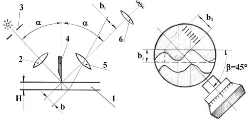 Метод светового сечения заключается в следующем: пучок световых лучей, поступающих от источника света через узкую щель 3 (рисунок 1.17, а) шириной около 0,1 мм, направляется объективом 2 под углом