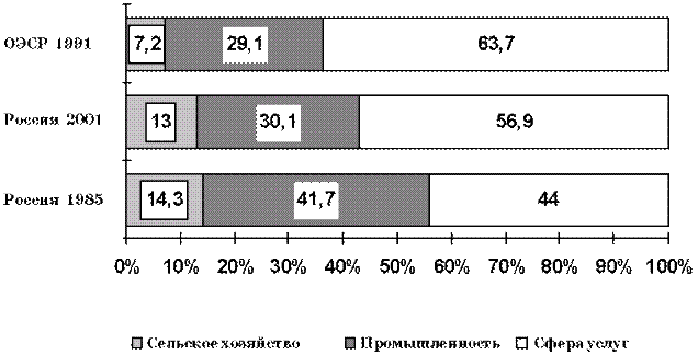 Сравнение с развитыми странами (странами ОЭСР) показывает, что в России по-прежнему очень велика доля сельской занятости и менее развита сфера услуг.