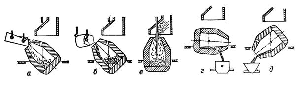 Производство стали из чугуна вели в окислительных кричных горнах (рисунок 44), а затем в пудлинговых печах (Г. Корт, 1784г.), конвертерах (Г. Бессемер, 1856г. и С. Дж. Томас, 1878г.), мартеновских печах (Эмиль и Пьер Мартены, 1864г.) и кислородных конвертерах.