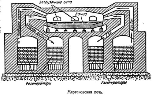 Процесс получения стали осуществляется в пламенной печи – мартеновской (рисунок 48). Тепло, необходимое для проведения процесса, получается посредством сжигания газообразного или жидкого топлива.