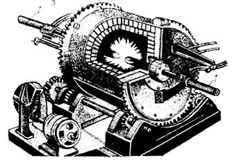 В 1900 г. в Швеции была пущена первая индукционная электропечь конструкции Челлина (рисунок 57). Важнейшее преимущество индукционной печи по сравнению с другими электроплавильными и нагревательными агрегатами состоит в том, что тепловая энергия возникает в самом нагреваемом материале за счет энергии электрического тока, проходящего по первичной обмотке. В индукционных печах обеспечивается наиболее равномерный прогрев металла и исключается вредное воздействие газов, образующихся в обычных печах от сгорания топлива или угольной дуги.