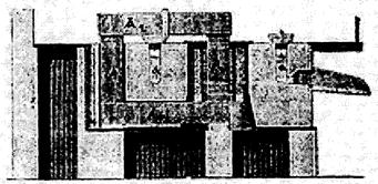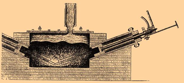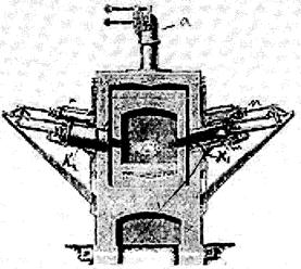 Основным элементом печи Пишона (рисунок 53) были две пары горизонтально расположенных электродов, между которым возбуждалась электрическая дуга. Смесь руды и угля пропускали через зону горения дуги, температура которой составляла 3000–3500 °С. Восстановленный углеродом металл плавился и собирался на поду электрической печи. Однако недостаточное количество электроэнергии, вырабатываемой в то время примитивными магнитоэлектрическими генераторами, не могло обеспечить нормальный ход металлургического процесса, и печь Пишона не получила практического использования.