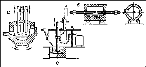 С самого начала использования электропечей в промышленности их преимущества ни у кого не вызывали сомнений. В электропечах достигалась более высокая температура, чем в других сталеплавильных агрегатах, легко переплавлялся скрап легированных сталей, можно было производить специальные высококачественные сплавы с тугоплавкими легирующими элементами при минимальном количестве вредных примесей. Поэтому всюду, где позволяли возможности получения достаточного количества электроэнергии, форсированно развивалась электрометаллургия. На рисунке 62 представлены схемы дуговых печей, применяемые и в настоящее время.