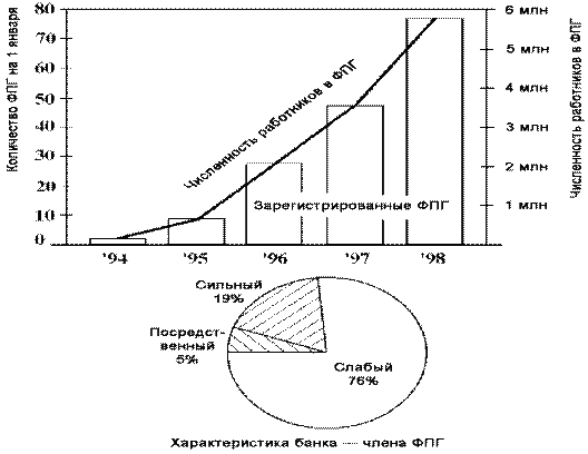 По ряду показателей хозяйственной деятельности ФПГ имеют значительно лучшие результаты, чем промышленность в целом. За 1997 г., например, промышленное производство в ФПГ увеличилось в 4 раза при нулевом темпе роста всей экономики. Особенно отчетливо проявился инвестиционный потенциал ФПГ. Инвестиции в реальный сектор в 15 ведущих ФПГ возросли на 250%.