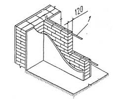 Перегородки толщиной 120 мм при длине до 5 метров и высоте до 3 метров выполняются без армирования. При больших размерах перегородки армируются полосовой или круглой сталью через 6 рядов кладки. Концы арматуры заводят в основные конструкции здания (рис. 11).
