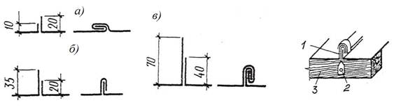 Рис. 19. Стальная кровля а) лежачий фальц; б) стоячий фальц; в) двойной стоячий фальц; 1" стоячий фальц; 2-клямер; 3-брус обрешетки.