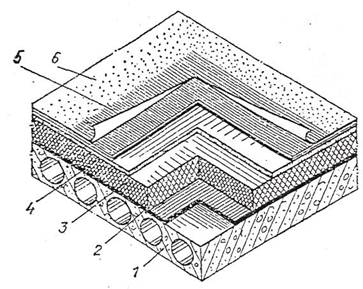 Рис. 20. Совмещенное покрытие 1-несущая железобетонная панель; 2-пароизоляция из слоя битумной мастики или однослойного рулонного ковра; 3-теплоизоляцияиз плитных и насыпных материалов; 4 – выравнивающая стяжка из цементного раствора или асфальтобетона; 5-четырехслойный рулонный ковер; 6-защитный слой мелкого гравия, втопленного в битумную мастику.