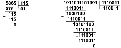Деление в любой позиционной системе счисления производится по тем же правилам, как и деление углом в десятичной системе. В двоичной системе деление выполняется особенно просто, ведь очередная цифра частного может быть только нулем или единицей.