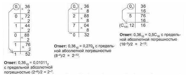 Пример. Переведем число 0,36 из десятичной системы в двоичную, восьмеричную и шестнадцатеричную: