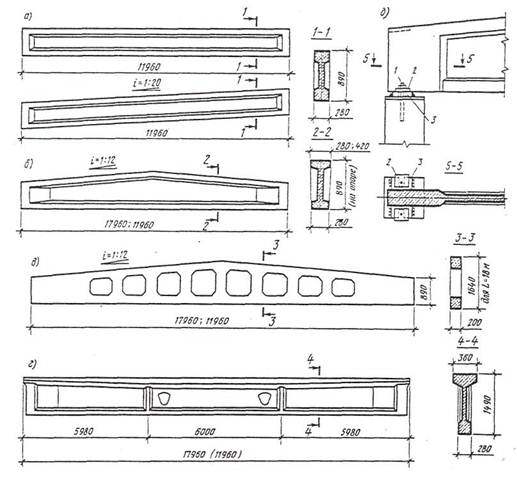 а), г) односкатные и плоские двутаврового сечения, б) то же, для многоскатных покрытий, в) решетчатая для многоскатных покрытий, д) узел опирания балки на колонну, 1 - анкерный болт, 2 - шайба, 3 - опорная плита