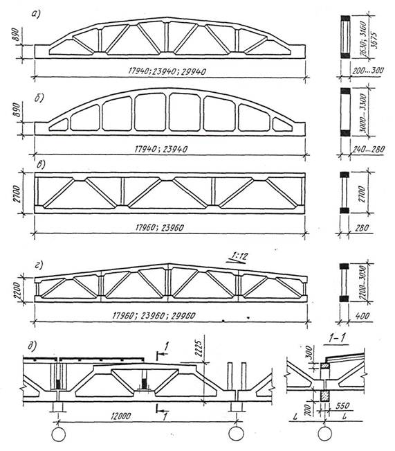 а) сегментная; б) арочная безраскосная; в) с параллельными поясами; г) трапецеидальная; д) фрагмент разреза покрытия здания с применением подстропильных ферм