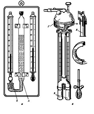 На рис. 2.1, б изображен аспирационный психрометр Ассмана М-34. Он отличается от стационарного тем, что резервуары обоих термометров помещены в специальные металлические трубочки-гильзы В, через которые с помощью механического вентилятора Г просасывается воздух с постоянной скоростью (около 2 м/с).
