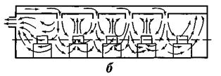 | Рис.2.4. Способы подачи воздуха: а) верхняя пассивная подача воздуха; б) активная подача воздуха; в и г) верхняя веерная подача воздуха. |