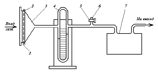 | Рис. 3.2. Схема установки для отбора проб воздуха: 1 - прижимная гайка; 2 - фильтр АФА; 3 - фильтродержатель (аллонж); 4 - расходомер; 5 - регулировочный кран; 6 - тройник; 7 - аспиратор |