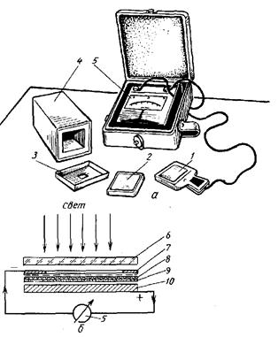 | Рис.5.1. Общий вид (а) и схема устройства (б) люксметра Ю-16: 1 - фотоэлемент; 2 - светофильтр; 3 - съемная крышка; 4 - насадка; 5 - гальванометр; 6 - светофильтр; 7 - полупрозрачный слой-электрод; 8 - запирающий слой лака; 9 - селеновый слой; 10 - пластина-электрод |