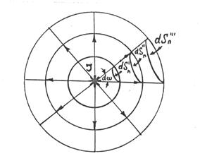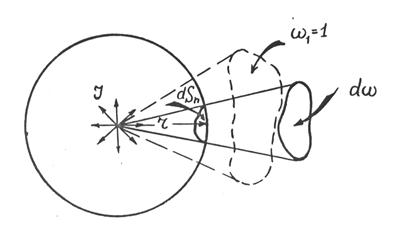 Рассмотрим ту часть dФ этого потока, которая излучается в телесный угол dw и пересекает часть dSn поверхности сферы. Индекс n в dSn означает, что площадка dSn оказывается нормальной (перпендикулярной) к радиусу - вектору, проведенному из центра сферы к центру этой площадки.