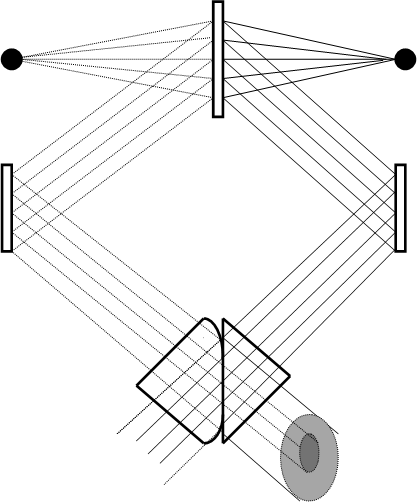 Здесь два источника света I1 и I2 посылают потоки света на центральную пластинку О, с обеих сторон покрытую белым шероховатым слоем, диффузно отражающим потоки в направлении пластин а и б, покрытых таким же слоем. От этих пластин соответствующие потоки света попадают в ячейку Лумера-Бродхуна АВ. Эта ячейка состоит из двух прямоугольных стеклянных призм А и В, сложенных своими гипотенузами. У одной из них (А) грань, соответствующая гипотенузе, сошлифована по краям и в этом месте образует воздушный зазор с призмой В. Призы прижаты друг к другу так, что в месте соприкосновения представляют собой одно целое (оптический контакт).