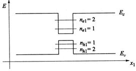 Полупроводниковые квантово-размерные структуры на основе гетеропереходов принято различать по числу направлений, вдоль которых происходит ограничение движения носителей заряда (электронов или дырок). Если их движение ограничено вдоль одного из направлений, например, вдоль оси х 1,то мы имеем дело с так называемой квантовой ямой. Для гетеропереходов 1-го типа такая структура изображена на рис. 1.3.