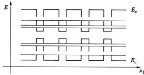 Наличие барьеров конечной высоты и протяженности дает возможность электронам и дыркам туннелировать из одной ямы в другую. В результате чего их дискретные уровни расщепляются в так называемые минизоны. Наличие трансляционной симметрии вдоль направления роста сверхрешетки (направление х 1)приводит к появлению дополнительного непрерывного квантового числа — сверхрешетчатого волнового вектора К 1(-p/ D > K 1 ³ p/ D). Таким образом, энергетический спектр носителей заряда в одномерной сверхрешетке будет состоять из чередующихся полос разрешенных и запрещенных энергий: