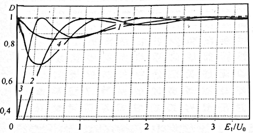 | Рис. 1.7. Зависимость коэффициента прохождения частицы над потенциальной ямой от энергии: 1-U0/V=1, 2- U0/V=2, 3- U0/V=3, 4 - U0/V=4 |