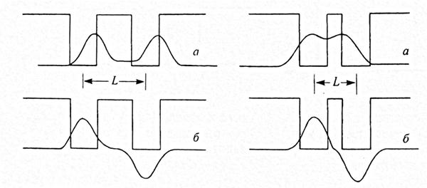 | Рис. 1.15. Волновые функции для предельного случая, когда барьер только что исчез | Рис. 1.16. Зависимости энергии от L для симметричного (а) и антисимметричного (б) состояний в связанных квантовых ямах |