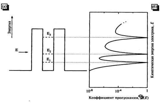 | Рис. 6.7. (а) Схема преодоления электроном с энергией E двойного резонансного барьера. Квантовая яма имеет три энергетических уровня (Е 1, Е 2и Е 3);(б) зависимость коэффициента пропускания от энергии падающего электрона. |