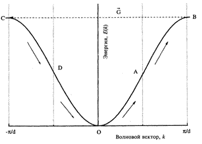 В соответствии с решением (6.5) волновой вектор должен возрастать линейно по времени. Будем считать, что электрон первоначально покоился в точке О начала координатной оси, как показано на рис. 6.8, а направление электрического поля противоположно направлению вектора k. При этом электрон начинает двигаться из точки О по направлению к точке А,и это движение продолжается до тех пор, пока он не достигнет точки В, соответствующей границе зоны Бриллюэна (k = p/ d). В точке В его скорость уменьшается до нуля, в соответствии с нулевым углом наклона кривой, как следует из уравнения (2.52). После этого электрон переносится в точку С (по вектору обратной решетки G),которой соответствует значение волнового вектора k = -p/ d,что просто означает результат брэгговского отражения. Из точки С электрон в k -пространстве под воздействием поля смещается через точку В в точку О, завершая тем самым цикл движения. Скорость электрона при таком периодическом движении определяется уравнением