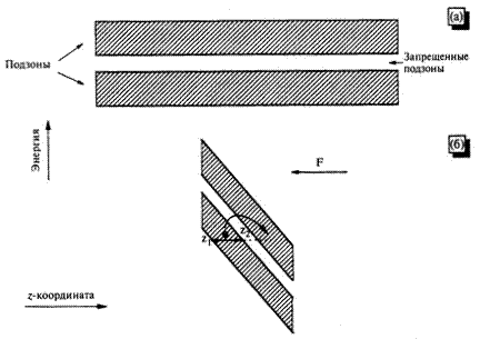 | Рис. 6.9. (а) Подзоны в сверхрешетке; (б) наклон подзон в сверхрешетке под воздействием приложенного электрического поля |