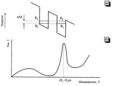 где Е 1и Е 2означают энергии уровней при наложенном поле F, которые не должны обязательно совпадать с значениями при отсутствии поля (F= 0). Как показано на рис. 6.10, б, область проявления эффекта отрицательного дифференциального сопротивления (NDR) располагается на вольт-амперной характеристике сверхрешетки сразу после резонансного пика, что позволяет использовать такие структуры, подобно диодам с резонансным туннелированием, в качестве высокочастотных осцилляторов и усилителей.