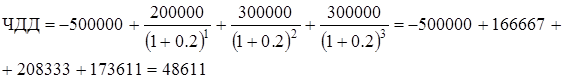 Задача 3. Имеется инвестиционный проект по модернизации, требующий инвестиций в размере 950000 руб. При этом ежегодный чистый доход составит 350000 руб. Номинальная ставка дисконтирования – 10%, ожидаемая ежегодная инфляция – 20%. Определить ЧДД с учётом инфляции, если горизонт расчёта 3 года, инвестиции осуществлялись в течение 1 года.