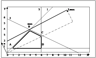 Линии, перпендикулярные этому вектору - L(x,y)=const, которые называются линиями уровня, задают одно из возможных значений целевой функции. На графике одно из этих уравнений, например L=-x+2y=6, задает прямую, которой соответствует значение L=6. Максимальное же значение целевой функции будет соответствовать, такой линии уровня, которая будет получена путем параллельного переноса одной из линий уровня, проходящей через область допустимых планов АВСД, в пограничную область АВСД в направлении вектора
