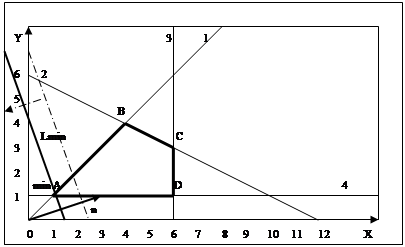 .Решением же системы является в нашем случае область АВСД, которая была образована пересечением четырех, выше найденных полуплоскостей. Область АВСД образует область допустимых решений или допустимых планов нашей задачи, в которой мы и будем искать оптимальное решение L=