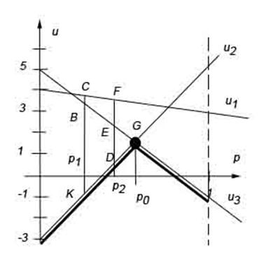 Изучим график. Если игрок А зафиксировал вероятность р1, то игрок В имеет возможность выбора стратегии из трёх вариантов: он выберет либо первую стратегию, тогда в среднем будет платить С единиц, либо вторую стратегию, тогда в среднем он будет платить К единиц, либо третью, тогда в среднем он будет платить В единиц. Естественно он заинтересован в наименьшей плате, поэтому он выберет стратегию 2.(точка К) Понимая это, игрок А захочет получить больший выигрыш и выберет другую вероятность, например, р2. Аналогичное рассмотрение этой вероятности игрока А и выбора игроком В платежей D, E, F, заключаем, что игрок В выберет опять стратегию 2 (точка D). Но при этом ему придётся платить больше, чем если бы игрок А выбрал вероятность р1. Из приведённого исследования видно, что для разных значений вероятности игрока А, платёж ему – это нижняя огибающая (выделенная жирная линия на рисунке). Тогда наилучший выбор для игрока А – это точка G.