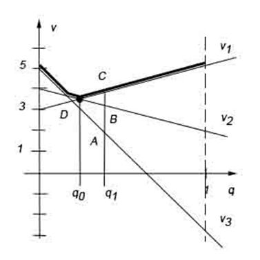 Изучим график. Если игрок В зафиксировал вероятность q1, то игрок А имеет возможность выбора стратегии из трёх вариантов: он выберет либо первую стратегию, тогда в среднем будет платить С единиц, либо вторую стратегию, тогда в среднем он будет платить В единиц, либо третью, тогда в среднем он будет платить А единиц. Естественно он заинтересован в наибольшей плате, поэтому он выберет стратегию 1. Понимая это, игрок В захочет заплатить меньше и выберет меньшее q, а именно q0. В результате для различных значений q приходим к верхней огибающей как наилучшем выборе стратегии для игрока А (выделенная жирная линия на рисунке). Тогда наилучший выбор для игрока А – это точка D.