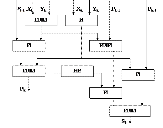 Рассмотрим построение логической схемы на примере одноразрядного сумматора, выполняющего арифметическое сложение двоичных чисел