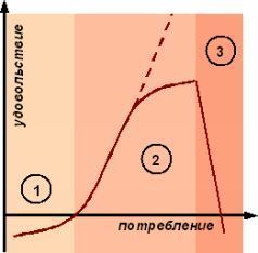 На первом участке (1), на этапе минимального удовлетворения, на этапе физически необходимого, человек голоден, он думает только о том, чтобы насытиться. Если у него мало денег, то он выбирает те продукты, которые дешевле и быстрее его накормят.